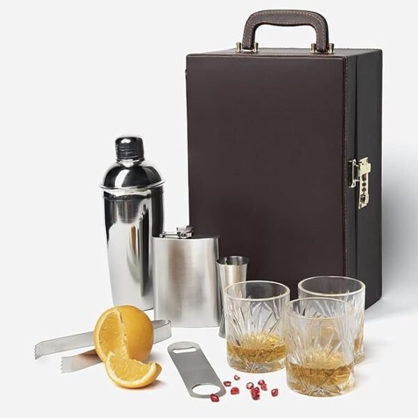 Presents Premium Portable Bar Set with Travel Case ? 11-Piece Cocktail Shaker Set with Glasses, Tools & Lock ? Travel Mini Bar Kit for Home,Parties & Gifting ? Brown Leather Finish