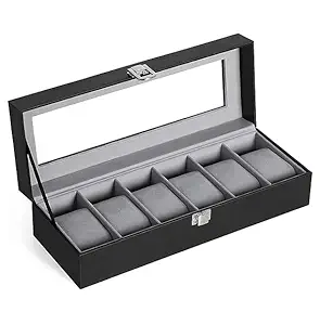 Presents Luxury Watch Box for Men & Women ? Lockable Leather Watch Organizer with Glass Lid, Soft Velvet Cushions, Premium Display & Storage Case for Watches -6 Slot Box (Black)