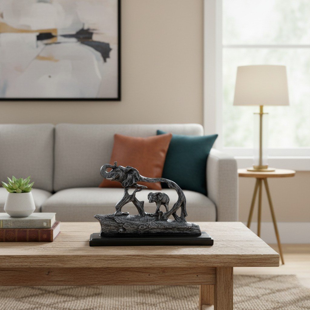 Invite Good Luck, Wisdom, and Harmony into Your Home with the Mother & Baby Elephant Sculpture. This exquisitely detailed elephant figurine captures the tender, protective bond between a mother and her calf, symbolizing unconditional love, strength, and family unity. The majestic elephants are rendered in a sleek Black and Silver/Gold finish with a modern, artistic design, making it a perfect match for contemporary, exotic, or traditional home decor styles. Elephants with their Trunks Up are widely celebrated in and Feng Shui as powerful good luck charms, symbolizing the channeling and welcoming of positive energy, financial prosperity, and success. Placing this statue in your living area or office is believed to draw these auspicious energies into your life. Meticulously crafted from premium polyresin for lasting durability, this showpiece is the perfect size for display on your mantelpiece, end table, office desk, or as a loving accent in a nursery. It is not just a decoration; it is a meaningful keepsake and a timeless piece of art. Give the gift of good fortune and strong family ties with this stunning Mother and Baby Elephant statue.