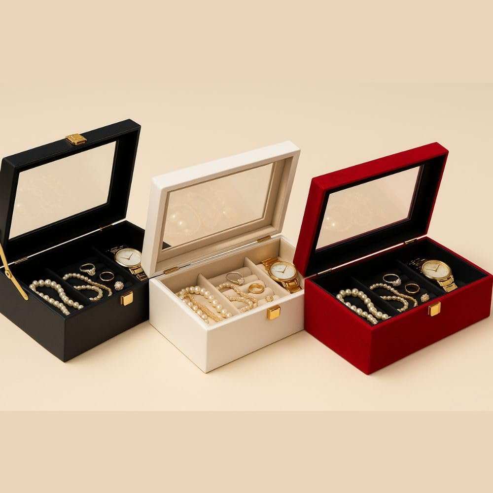 Be the first to review “Luxury Storage Box with Glass Lid, Decorative Organiser Box for Jewellery and Accessories, Available in Red, Black, White (Red)” Cancel reply