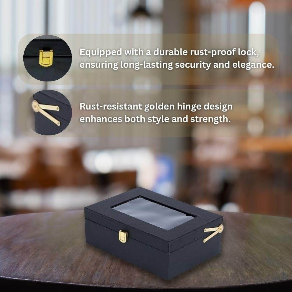 This multipurpose storage box with a transparent lid is the perfect blend of elegance and practicality. Featuring a sleek design with a clear window, this box allows you to showcase or access your stored items effortlessly. The secure gold-tone clasp ensures safety while enhancing the aesthetic appeal. Whether you’re organizing jewelry, watches, accessories, or gifting someone special, this storage box is a versatile solution for home, office, or retail use.