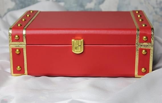 Add a vibrant touch of luxury to your space with this red decorative storage trunk box. Designed with a bold red finish and shiny gold detailing, this elegant organizer is as stylish as it is functional. Perfect for storing keepsakes, trinkets, jewelry, and other cherished items, this box is a decorative piece that suits any room setting. Ideal for personal use or as a premium gifting option for birthdays, weddings, or festive occasions.