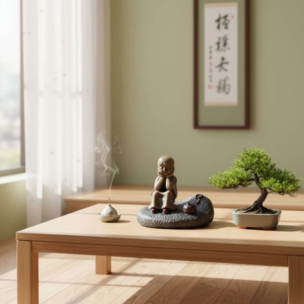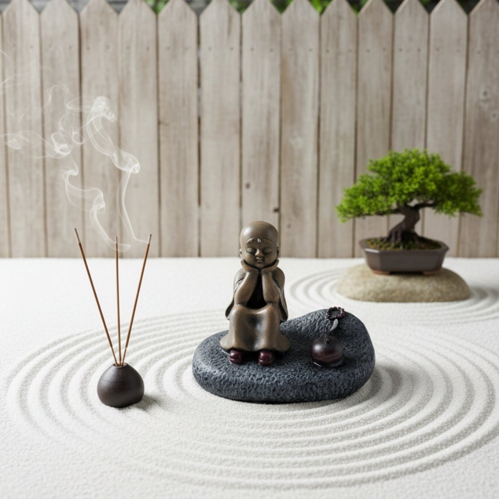 Find Serenity and Calm with the Thinking Monk Statue. This exquisitely crafted Serene Thinking Monk Figurine captures a moment of quiet reflection that is instantly calming. With his eyes gently closed and hands supporting his head, this Baby Buddha statue encourages the observer to pause, breathe, and contemplate the present moment. Made from durable high-quality resin, the statue features a beautiful, non-glossy finish that gives it a tactile, ancient look. The little monk is seated on a detailed, textured stone base that secures the figurine. A small, decorative item (possibly an incense holder or prayer beads) sits beside him, adding to the spiritual ambiance. Ideal for setting a mindful tone, this Zen Monk Sculpture is a wonderful addition to your home decor, be it in your living room, home office, or a dedicated meditation space. It?s also a deeply meaningful peace gift that offers blessings of tranquility and wisdom to the recipient.