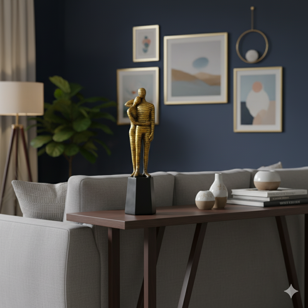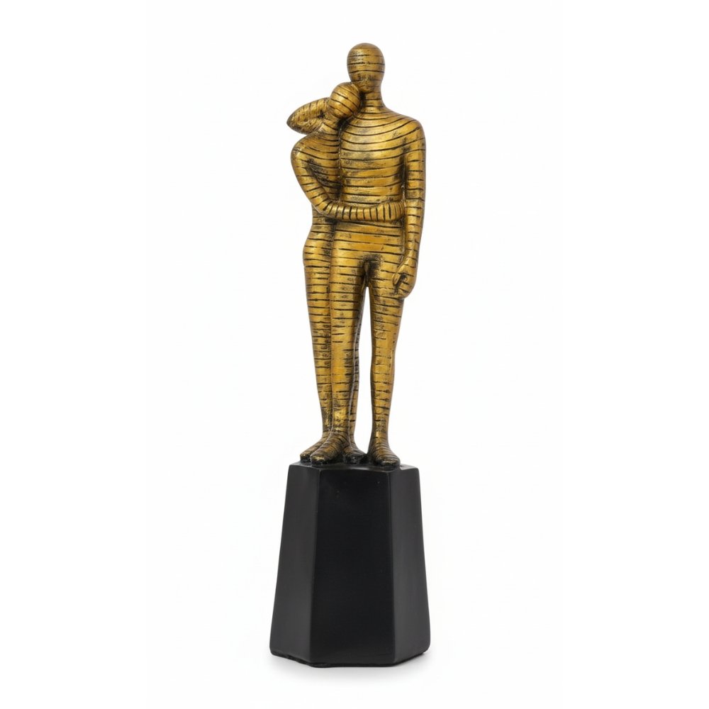 Abstract Couple Embrace Statue – Golden Striped Lovers Sculpture on Black Pedestal – Modern Resin Showpiece for Home Decor & Anniversary Gift